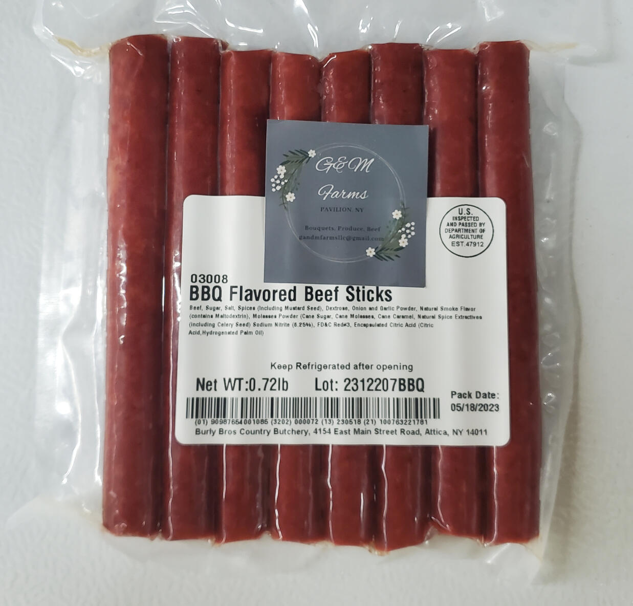We currently have BBQ beef sticks for $20 a pound packed 11/2024.USDA inspected and vacuum sealed by Burly brothers country butchery. Includes local delivery.
